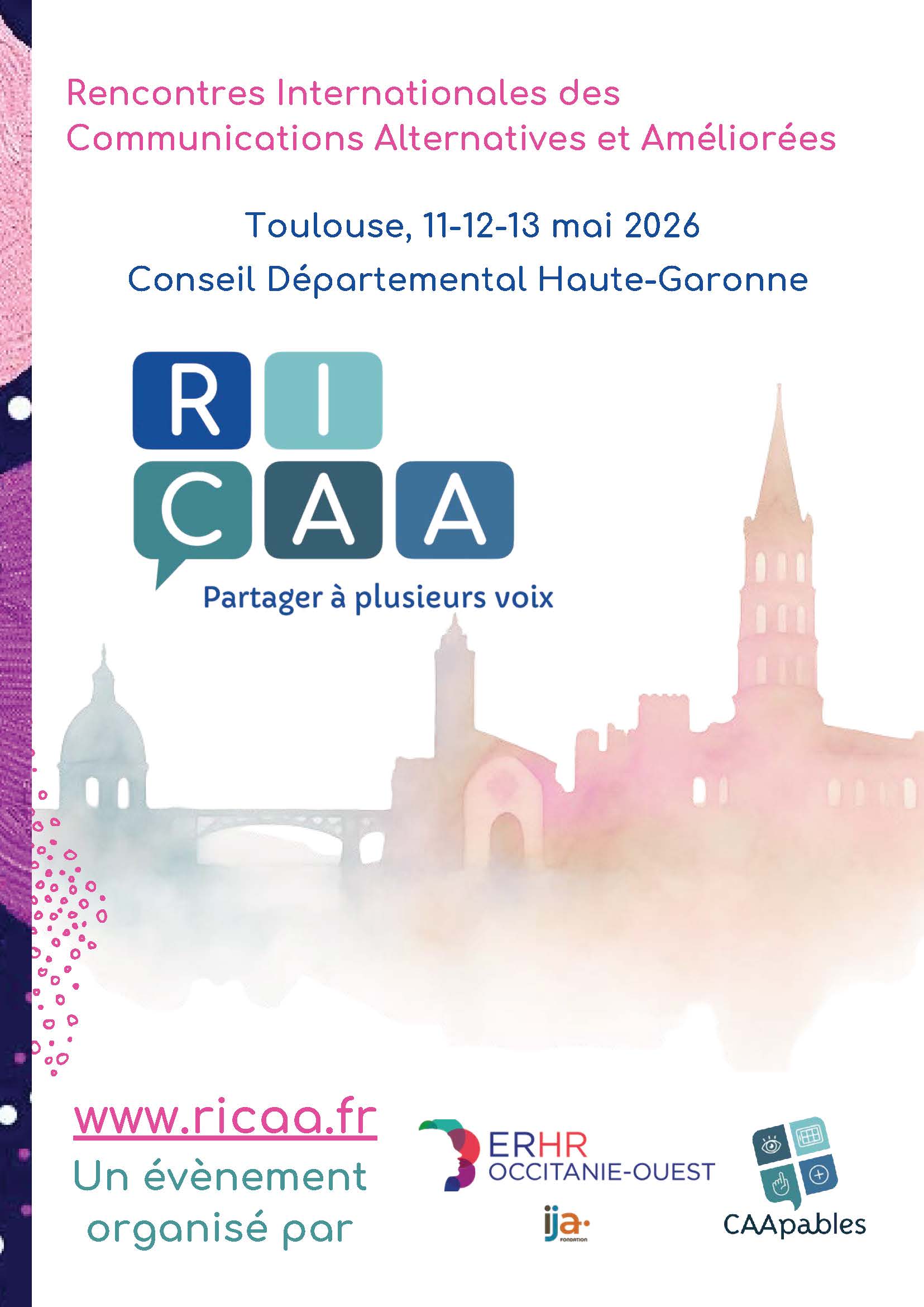Les Rencontres Internationales des CAA sont organisées conjointement par l’Equipe Relais Handicaps Rares Occitanie Ouest et l’organisme de formation CAApables, dans le prolongement de leurs actions autour des Communications Alternatives et Améliorées (CAA) initiées en 2019 en région Occitanie.