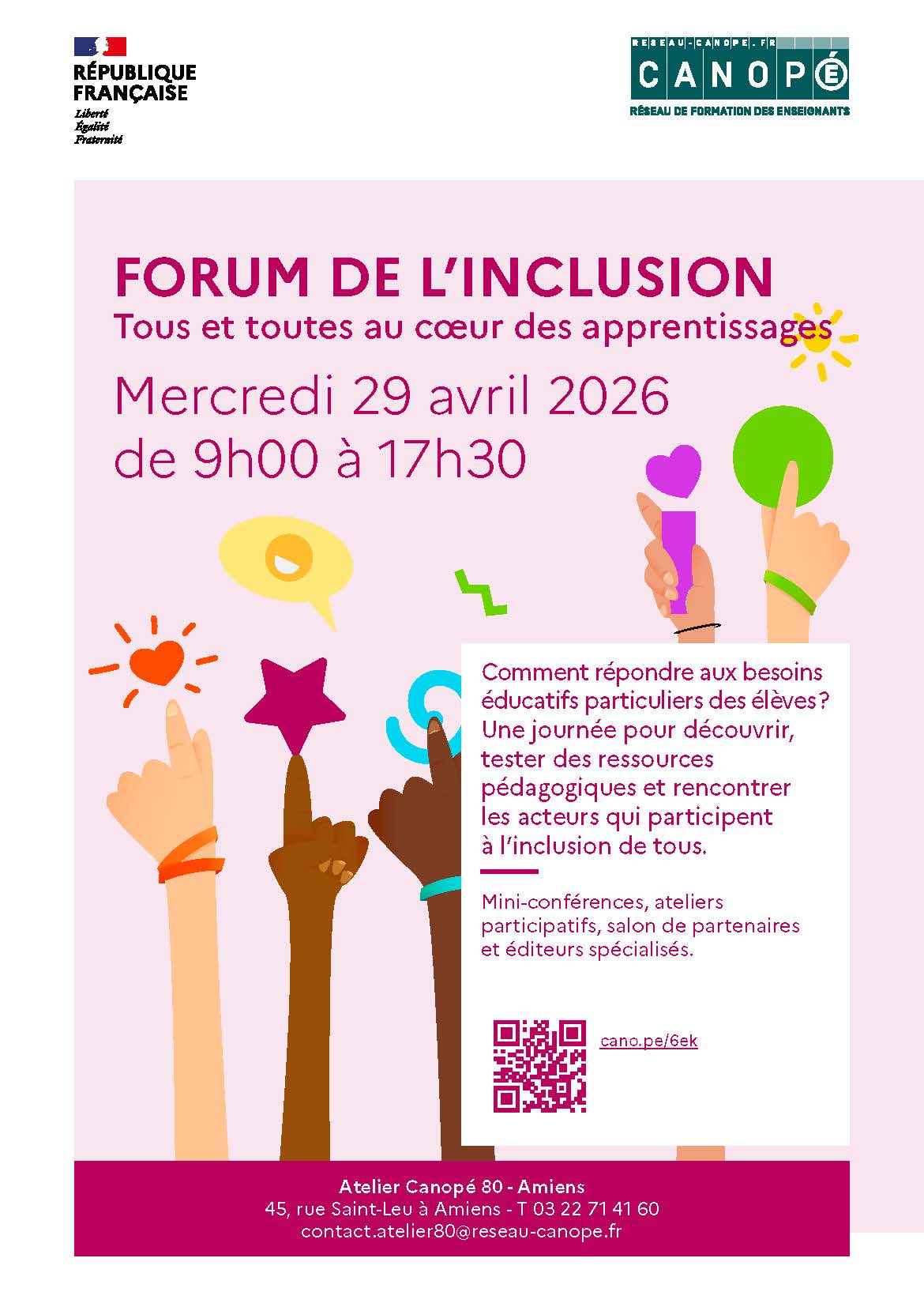 L’Atelier Canopé d’Amiens vous convie à son 3e forum de l’inclusion // Tous et toutes au cœur des apprentissages, le mercredi 29 avril 2026, de 9h à 17h30.