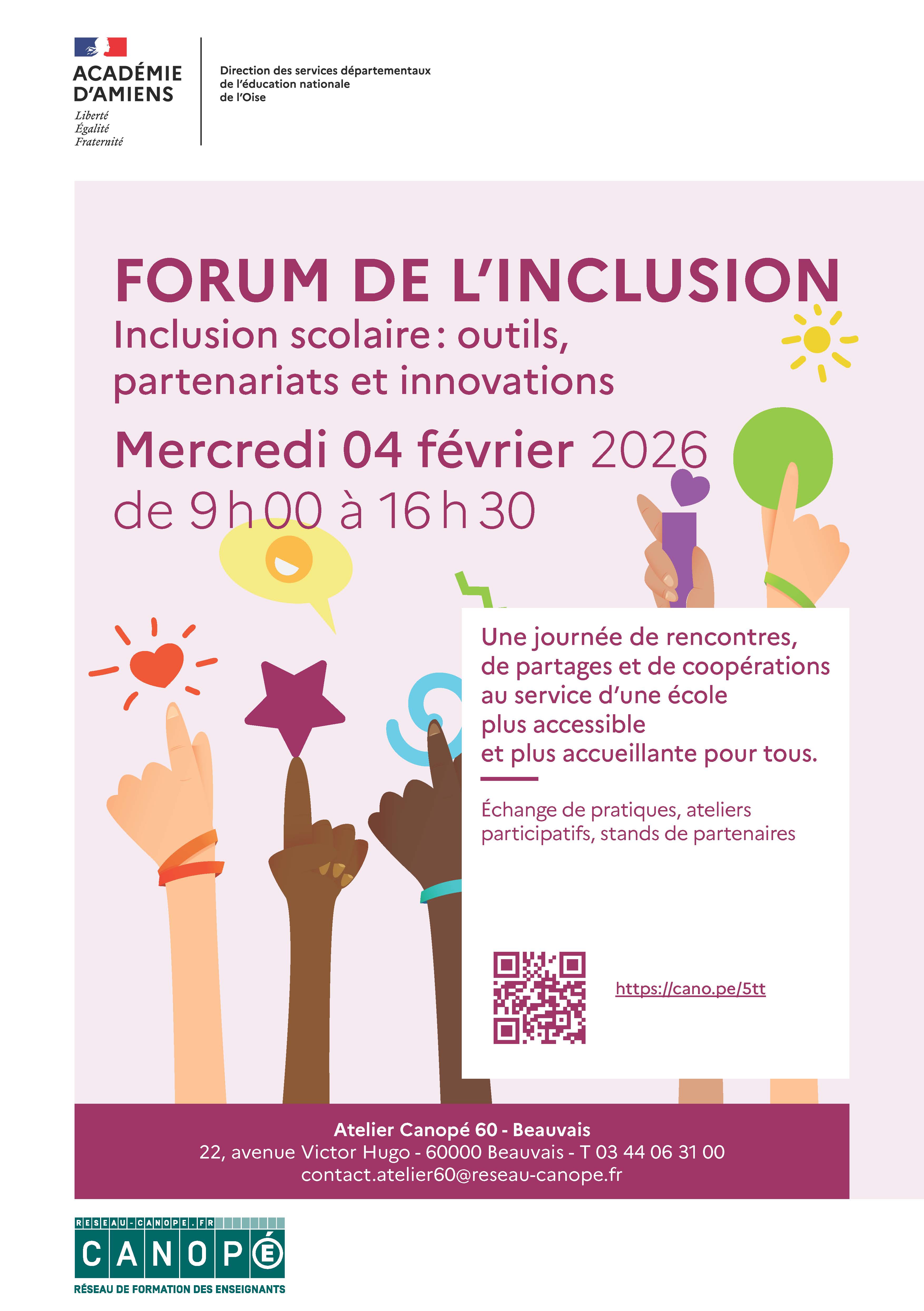 L’Atelier Canopé de Beauvais vous invite à prendre part au 1er Forum de l’inclusion // Inclusion scolaire : outils, partenariats et innovations, qui se tiendra le mercredi 4 février 2026, de 9h à 16h30.