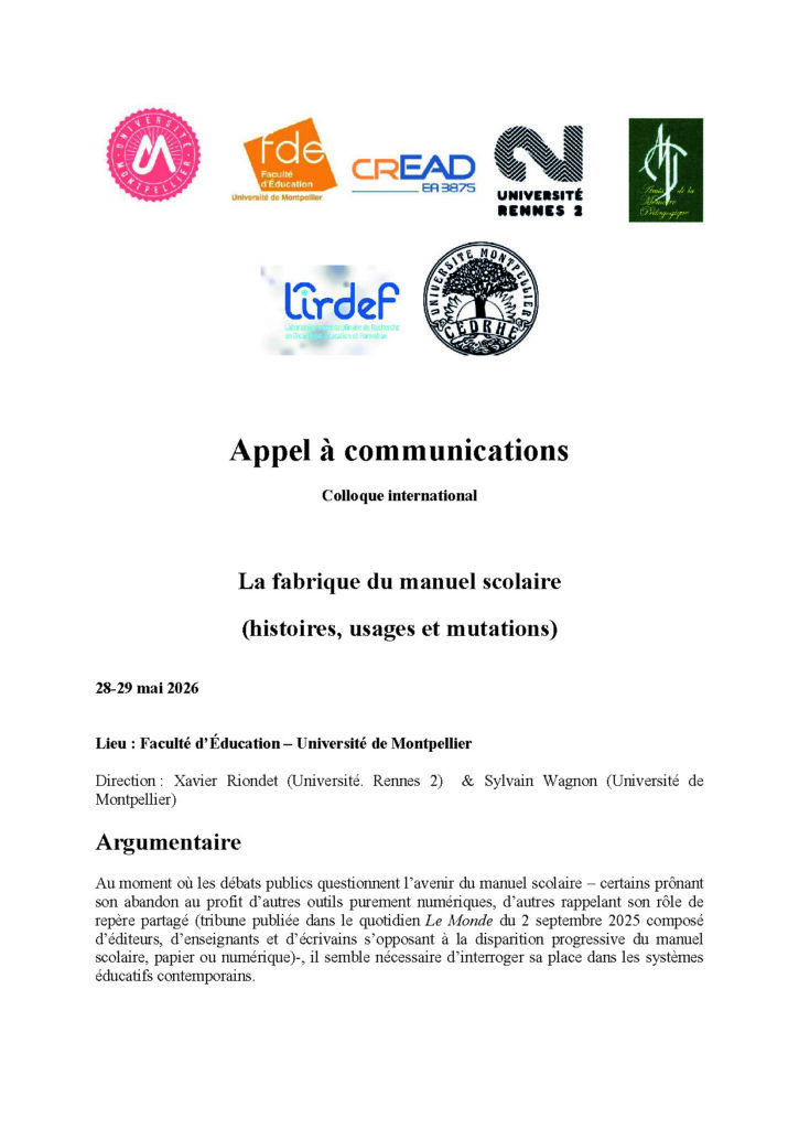28 – 29 mai 2026 – Colloque international « La fabrique du manuel scolaire »