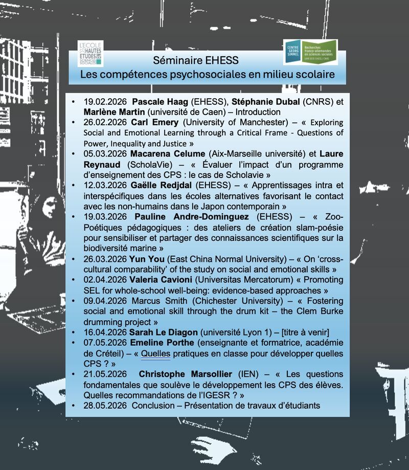 19 février – 28 mai 2026 – Séminaire EHESS – Les compétences psychosociales en milieu scolaire