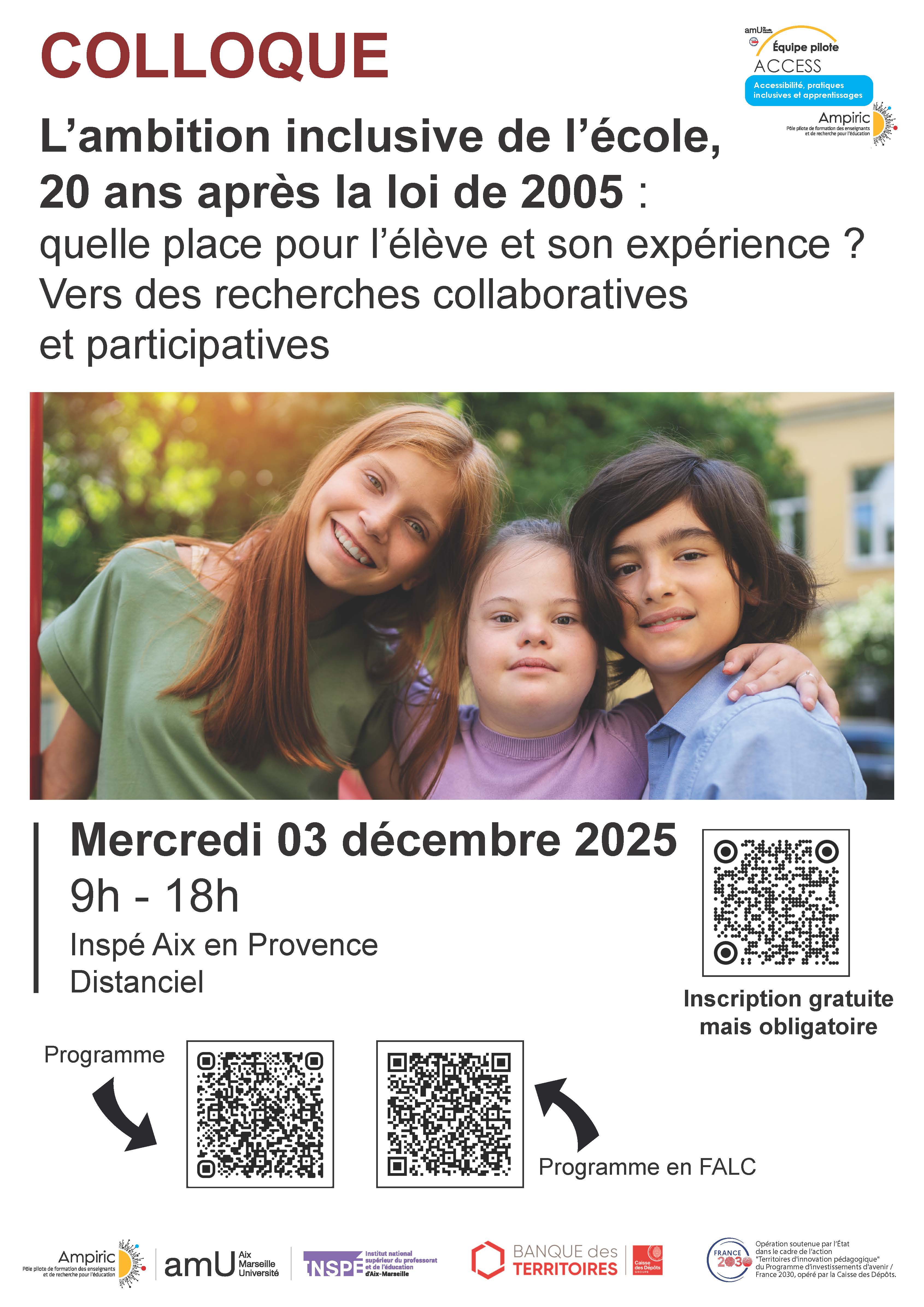 3 décembre 2025 – Colloque « L’ambition inclusive de l’école : 20 ans après la loi de 2005, quelle place pour l’élève et son expérience ? »