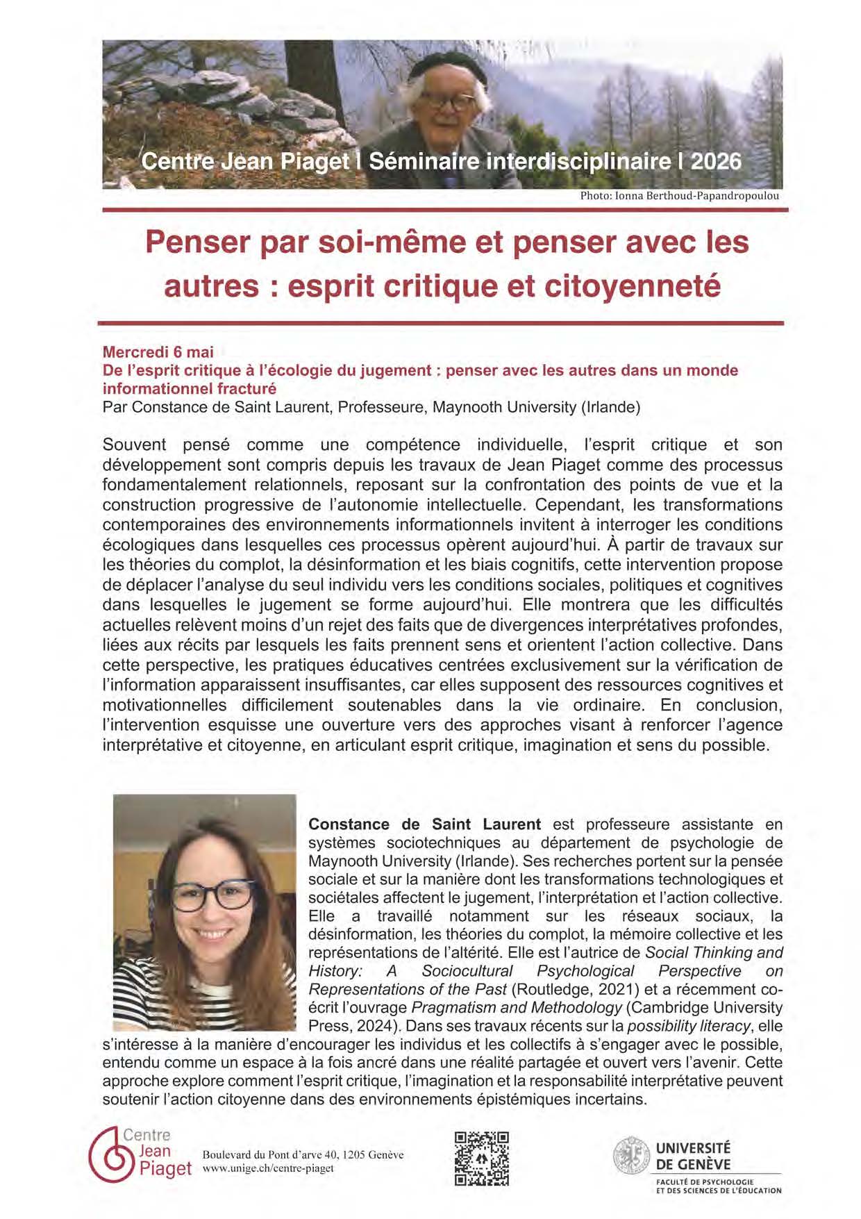 6 mai 2026 – Séminaire du Centre Jean Piaget – De l’esprit critique à l’écologie du jugement : penser avec les autres dans un monde informationnel fracturé