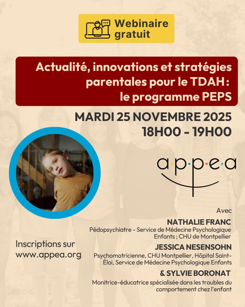 25 novembre 2025 – Webinaire gratuit de l’APPEA – Actualité, innovations et stratégies parentales pour le TDAH : le programme PEPS