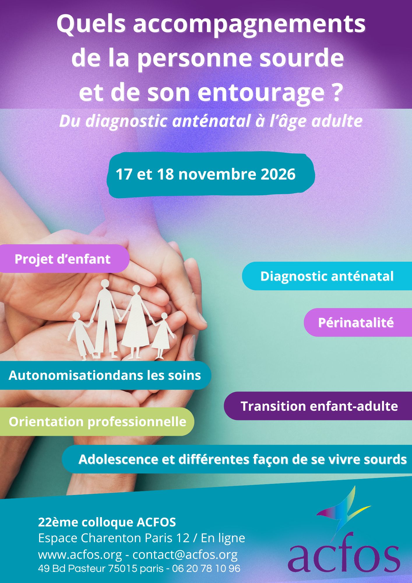 17 – 18 novembre 2026 – 22e Colloque ACFOS – Quels accompagnements de la personne sourde et de son entourage ? Du diagnostic anténatal à l’âge adulte