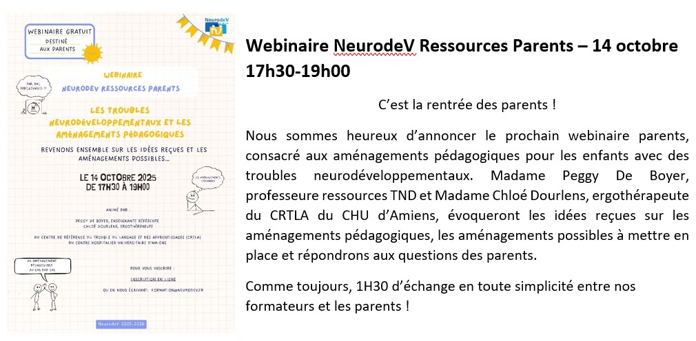 14 octobre 2025 – Webinaire NeurodeV Ressources Parents – Les TND et les aménagements pédagogiques